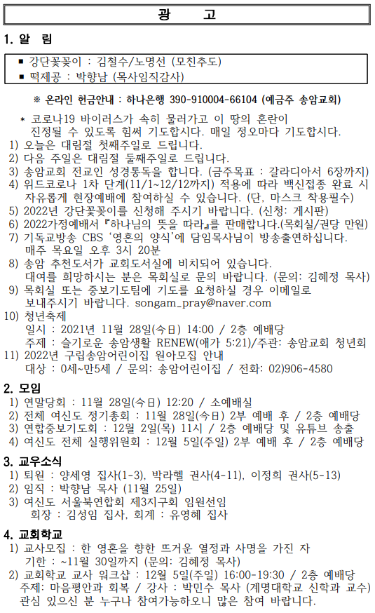 ¡Ø ¿Â¶óÀÎ Çå±Ý¾È³» : ÇϳªÀºÇà 390-910004-66104 (¿¹±ÝÁÖ ¼Û¾Ï±³È¸) * Äڷγª19 ¹ÙÀÌ·¯½º°¡ ¼ÓÈ÷ ¹°·¯°¡°í ÀÌ ¶¥ÀÇ È¥¶õÀÌ ÁøÁ¤µÉ ¼ö ÀÖµµ·Ï Èû½á ±âµµÇսôÙ. ¸ÅÀÏ Á¤¿À¸¶´Ù ±âµµÇսôÙ. 1) ¿À´ÃÀº ´ë¸²Àý ù°ÁÖÀÏ·Î µå¸³´Ï´Ù. 2) ´ÙÀ½ ÁÖÀÏÀº ´ë¸²Àý µÑ°ÁÖÀÏ·Î µå¸³´Ï´Ù. 3) ¼Û¾Ï±³È¸ Àü±³ÀÎ ¼º°æÅëµ¶À» ÇÕ´Ï´Ù. (±ÝÁÖ¸ñÇ¥ : °¥¶óµð¾Æ¼ 6Àå±îÁö) 4) À§µåÄڷγª 1Â÷ ´Ü°è(11/1~12/12±îÁö) Àû¿ë¿¡ µû¶ó ¹é½ÅÁ¢Á¾ ¿Ï·á ½Ã ÀÚÀ¯·Ó°Ô ÇöÀ忹¹è¿¡ Âü¿©ÇÏ½Ç ¼ö ÀÖ½À´Ï´Ù. (´Ü, ¸¶½ºÅ© Âø¿ëÇʼö) 5) 2022³â °´Ü²É²ÈÀ̸¦ ½ÅÃ»ÇØ Áֽñ⠹ٶø´Ï´Ù. (½Åû: °Ô½ÃÆÇ) 6) 2022°¡Á¤¿¹¹è¼ ¡ºÇϳª´ÔÀÇ ¶æÀ» µû¶ó¡»¸¦ ÆÇ¸ÅÇÕ´Ï´Ù.(¸ñȸ½Ç/±Ç´ç ¸¸¿ø) 7) ±âµ¶±³¹æ¼Û CBS ¡®¿µÈ¥ÀÇ ¾ç½Ä¡¯¿¡ ´ãÀÓ¸ñ»ç´ÔÀÌ ¹æ¼ÛÃ⿬ÇϽʴϴÙ. ¸ÅÁÖ ¸ñ¿äÀÏ ¿ÀÈÄ 3½Ã 20ºÐ 8) ¼Û¾Ï Ãßõµµ¼°¡ ±³È¸µµ¼½Ç¿¡ ºñÄ¡µÇ¾î ÀÖ½À´Ï´Ù. ´ë¿©¸¦ Èñ¸ÁÇϽô ºÐÀº ¸ñȸ½Ç·Î ¹®ÀÇ ¹Ù¶ø´Ï´Ù. (¹®ÀÇ: ±èÇýÁ¤ ¸ñ»ç) 9) ¸ñȸ½Ç ¶Ç´Â Áߺ¸±âµµÆÀ¿¡ ±âµµ¸¦ ¿äûÇÏ½Ç °æ¿ì À̸ÞÀÏ·Î º¸³»Áֽñ⠹ٶø´Ï´Ù. songam_pray@naver.com 10) û³âÃàÁ¦ ÀϽà : 2021³â 11¿ù 28ÀÏ(ÐÑìí) 14:00 / 2Ãþ ¿¹¹è´ç ÁÖÁ¦ : ½½±â·Î¿î ¼Û¾Ï»ýȰ RENEW(¾Ö°¡ 5:21)/ÁÖ°ü: ¼Û¾Ï±³È¸ û³âȸ 11) 2022³â ±¸¸³¼Û¾Ï¾î¸°ÀÌÁý ¿ø¾Æ¸ðÁý ¾È³» ´ë»ó : 0¼¼~¸¸5¼¼ / ¹®ÀÇ: ¼Û¾Ï¾î¸°ÀÌÁý / ÀüÈ: 02)906-4580 2. ¸ðÀÓ 1) ¿¬¸»´çȸ : 11¿ù 28ÀÏ(ÐÑìí) 12:20 / ¼Ò¿¹¹è½Ç 2) Àüü ¿©½Åµµ Á¤±âÃÑȸ : 11¿ù 28ÀÏ(ÐÑìí) 2ºÎ ¿¹¹è ÈÄ / 2Ãþ ¿¹¹è´ç 3) ¿¬ÇÕÁߺ¸±âµµÈ¸ : 12¿ù 2ÀÏ(¸ñ) 11½Ã / 2Ãþ ¿¹¹è´ç ¹× À¯Æ©ºê ¼ÛÃâ 4) ¿©½Åµµ Àüü ½ÇÇàÀ§¿øÈ¸ : 12¿ù 5ÀÏ(ÁÖÀÏ) 2ºÎ ¿¹¹è ÈÄ / 2Ãþ ¿¹¹è´ç 3. ±³¿ì¼Ò½Ä 1) Åð¿ø : ¾ç¼¼¿µ Áý»ç(1-3), ¹Ú¶óÇï ±Ç»ç(4-11), ÀÌÁ¤Èñ ±Ç»ç(5-13) 2) ÀÓÁ÷ : ¹ÚÇâ³² ¸ñ»ç (11¿ù 25ÀÏ) 3) ¿©½Åµµ ¼¿ïºÏ¿¬ÇÕȸ Á¦3Áö±¸È¸ ÀÓ¿ø¼±ÀÓ È¸Àå : ±è¼ºÀÓ Áý»ç, ȸ°è : À¯¿µÇý Áý»ç 4. ±³È¸Çб³ 1) ±³»ç¸ðÁý : ÇÑ ¿µÈ¥À» ÇâÇÑ ¶ß°Å¿î ¿Á¤°ú »ç¸íÀ» °¡Áø ÀÚ ±âÇÑ : ~11¿ù 30ÀϱîÁö (¹®ÀÇ: ±èÇýÁ¤ ¸ñ»ç) 2) ±³È¸Çб³ ±³»ç ¿öÅ©¼¥ : 12¿ù 5ÀÏ(ÁÖÀÏ) 16:00-19:30 / 2Ãþ ¿¹¹è´ç ÁÖÁ¦: ¸¶À½Æò¾È°ú ȸº¹ / °»ç : ¹Ú¹Î¼ö ¸ñ»ç (°è¸í´ëÇб³ ½ÅÇаú ±³¼ö) °ü½É ÀÖÀ¸½Å ºÐ ´©±¸³ª Âü¿©°¡´ÉÇÏ¿À´Ï ¸¹Àº Âü¿© ¹Ù¶ø´Ï´Ù.